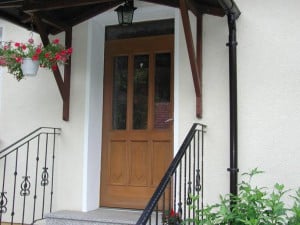 Holz Haustür Nusbaum lackiert mit Wiener Sprossen & Stoßgriff