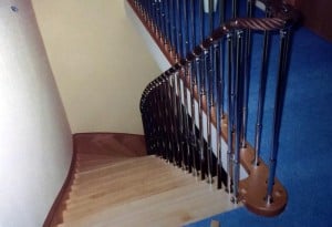 Massivholz Wangentreppe Buche Parkett 1/2 gewendelt als 2 übereinander liegende Treppen Handlauf 40 X 80 mm 1/2 stehender Krümmling & kegelförmige Geländerstäbe