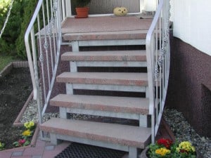 Außentreppe Stahlwangentreppe geradläufig mit Podest verzinkt auf Stützen stehend & Geländer mit Zierstäben & Flachstahl Handlauf & Granit Rosa Beta Trittstufen 60 mm