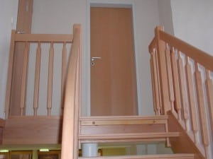 Massivholz Wangentreppe Buche 1/4 gewendelt Wand seitig eingestemmt Geländer seitig aufgesattelt Handlauf 40 X 80 mm & gedrechselte Geländerstäbe & Pfosten & 1/4 Handlauf Krümlig