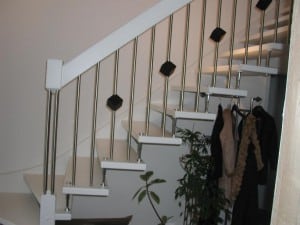 Massivholztreppe mit Brüstungsgeländer & Stahlseil und verchromten Teleskop Geländerstäben